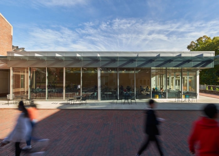 Szostak Design, Inc. transformed the Chase Dining Hall at UNC-Chapel Hill into an inviting dining destination, featuring a 3,950-square-foot glass pavilion that enhances transparency and student engagement in Chapel Hill, North Carolina.