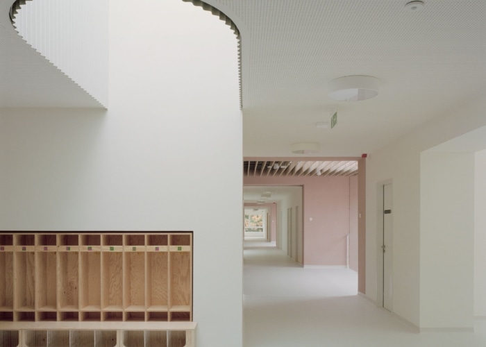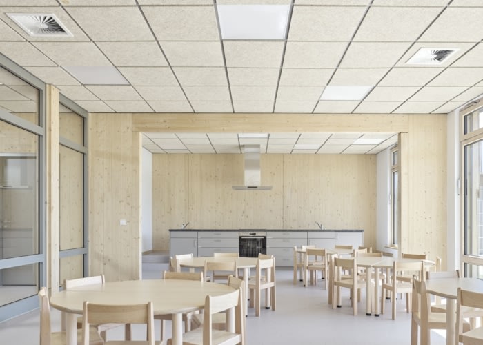 KITA Capri project by se\arch Architekten features a single-story, nature-integrated design with interconnected spaces, engaging play areas, and durable timber interiors, creating a dynamic facade with natural materials.