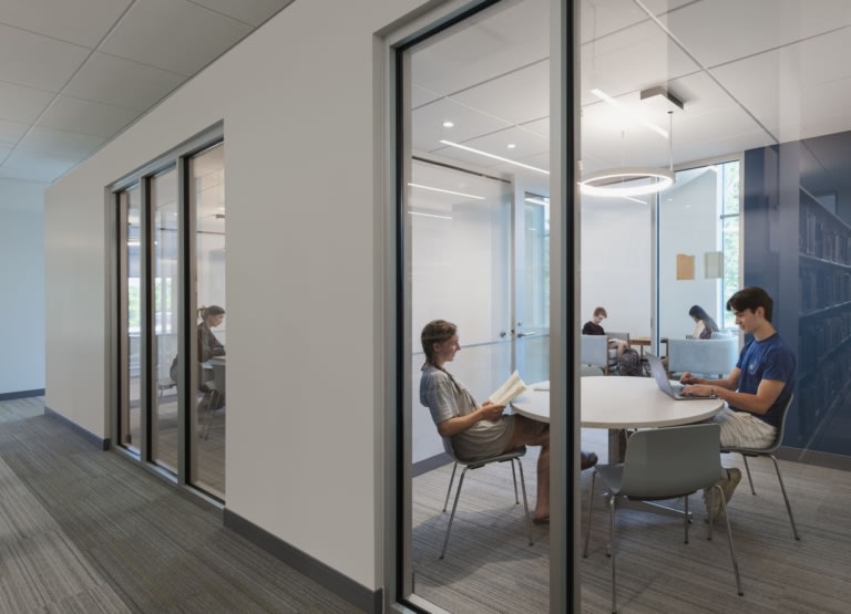 New Canaan Library View Project Centerbrook Architects and Planners Jeff Goldberg Glass Walls, Pendant Lighting, People, Recessed Downlight