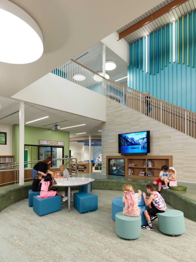 Greenway Elementary School View Project Hollis + Miller Architects Alistair Tutton Column, Library, People, Signs & Wayfinding, Stairs, Wall-Mounted Display