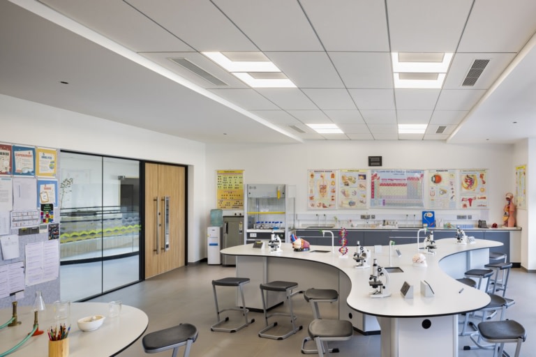 Wellington College International View Project Education Design International Andre Fanthome | Noughts and Crosses Glass Graphics, Lab Facilities, Pin Board, Stools