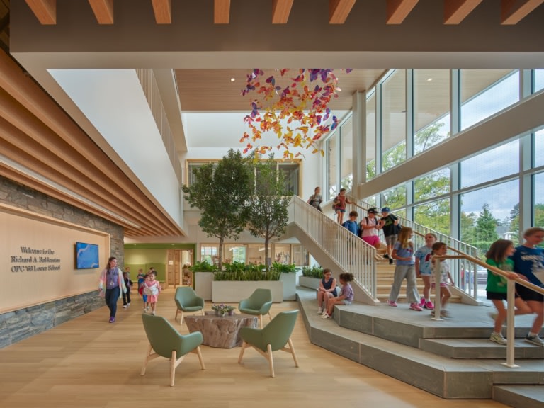 William Penn Charter School, Lower School View Project EwingCole Halkin | Mason Photography Chairs, lobby-reception, Plants, Signs & Wayfinding, Stairs, Wall-Mounted Display