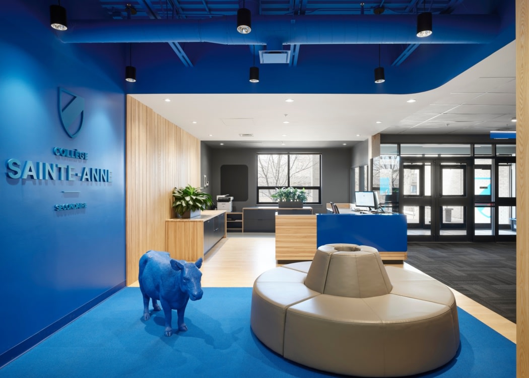 On the ground floor, the reception area is now a feature thanks to the removal of the enclosures. The emphasis placed on the emblematic colour of the school, the use of several Nordic wood species, and the integration of the school’s animal totem in a seated position creates an inviting environment and an enriching experience for visitors. A little further down the corridor, an alcove was added to provide a moment of respite from the busy focus of academia. Dubbed as the meditation zone, this space attracts attention thanks to its familiar cabin-like silhouette, which is highlighted by an iridescent zinc pediment whose reflective surface dances with the light in a subtle fashion, depending on the time of day and the position one stands in. This inviting environment provides the perfect setting for students needing to take a breather, to find their center again, or to simply be embraced by a moment of peace.