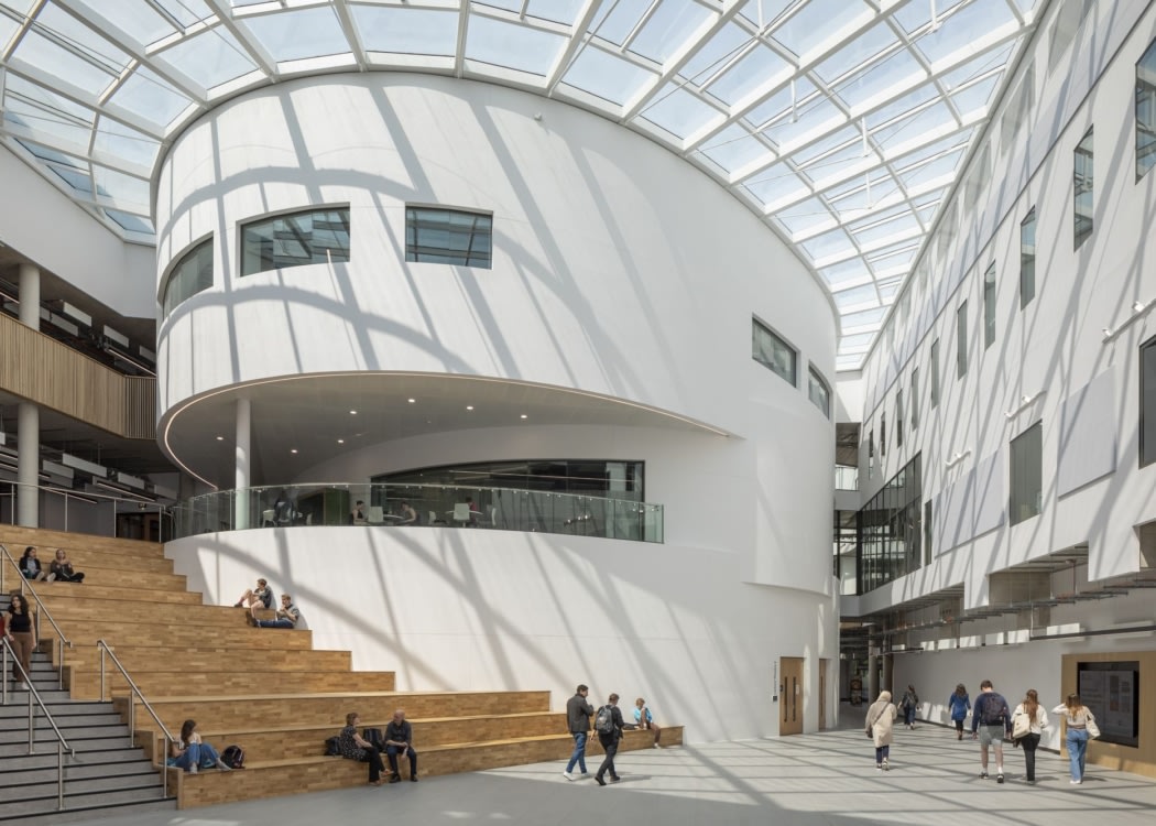 At the heart of the design is a light-filled atrium, crowned by a tessellated glass roof, which connects spaces both visually and physically. Overlapping floorplates reflect the interdisciplinary nature of the Social Sciences, encouraging natural interaction between staff, students, and researchers. Publicly accessible and welcoming, The Wave also opens its doors to the wider Sheffield community, featuring a vibrant café and pocket parks that create a lively and inclusive campus atmosphere.