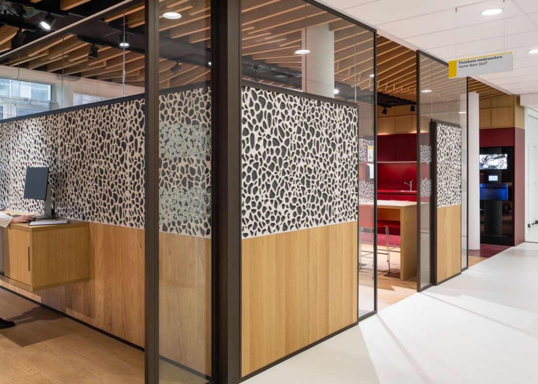 Extensive audits identified reusable building elements: shelving was transformed into lockers, glass partitions and furniture were adapted and reinstalled, and loose furniture was predominantly sourced as second‑life, refurbished or biobased. All changes were recorded in the BIM model with a materials passport to simplify future reuse. The interior is fully demountable and designed for disassembly; components with similar lifespans are paired to ease future replacements. Low‑impact, low‑emission materials with long lifespans were selected to reduce environmental impact and total cost of ownership.