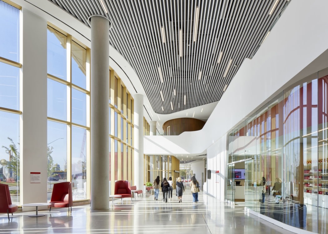 The 400,000 sf academic building accommodates 4,000 undergraduate and graduate students and brings together a collection of academic programs within a 10-storey academic tower. Collaboration between these diverse programs is supported by interconnected floor spaces, fluid spatial geometry, and visually connected work zones, creating an animated crossroads of learning, inquiry, and student engagement. Student programs and services are situated on the building’s lower floors in the podium, serving as a student hub for the university, while also fostering connections with the community. The upper levels are occupied by academic programs–each one housed on a different floor within its own wing–and administrative offices. The building opens onto a Campus Green at three levels, further strengthening its connection to the site’s new landscape and surroundings through a continuous sequence of informal, exterior public spaces.