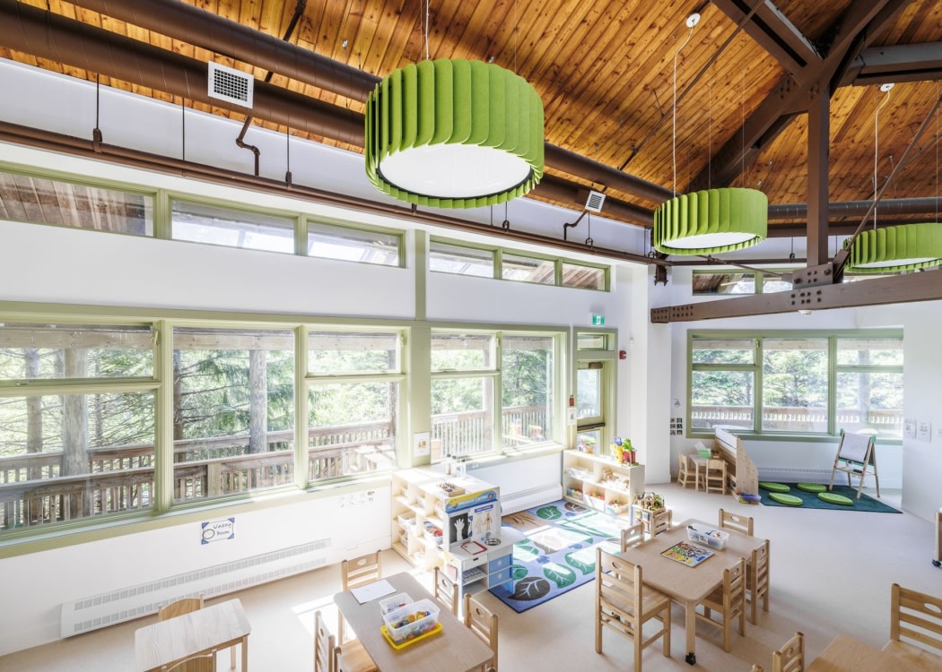 New interior partitions were designed to stop short of the original timber beams, preserving sightlines and structural clarity. Large, circular windows were incorporated into these walls to promote a sense of openness, interconnectedness, and belonging—reflecting the center’s commitment to child-centered, holistic learning.