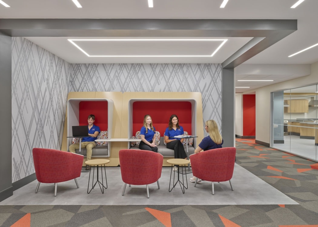 Highlighting the state-of-the-art equipment that sets the university apart for its highly recognized programs, the renovation features subtle branding that reflects the university’s energetic and driven spirit, strategic lighting to keep the students engaged, and durable finishes that create a streamlined learning environment for the next generation of healthcare leaders. One of the most notable changes on the main level is the transformation of a multi-tiered lecture hall into a radiology suite, complete with new imaging machines and a large instructional space. Learning goes far beyond the classroom with a new Clinical Simulation Center with four patient rooms designed to simulate a different hospital setting: intensive care unit (ICU), emergency department, pediatric/maternity care and post-acute care. These simulation spaces allow students to learn with hands-on experiences, getting as close to real scenarios as possible to prepare them for their licensure examinations and careers.