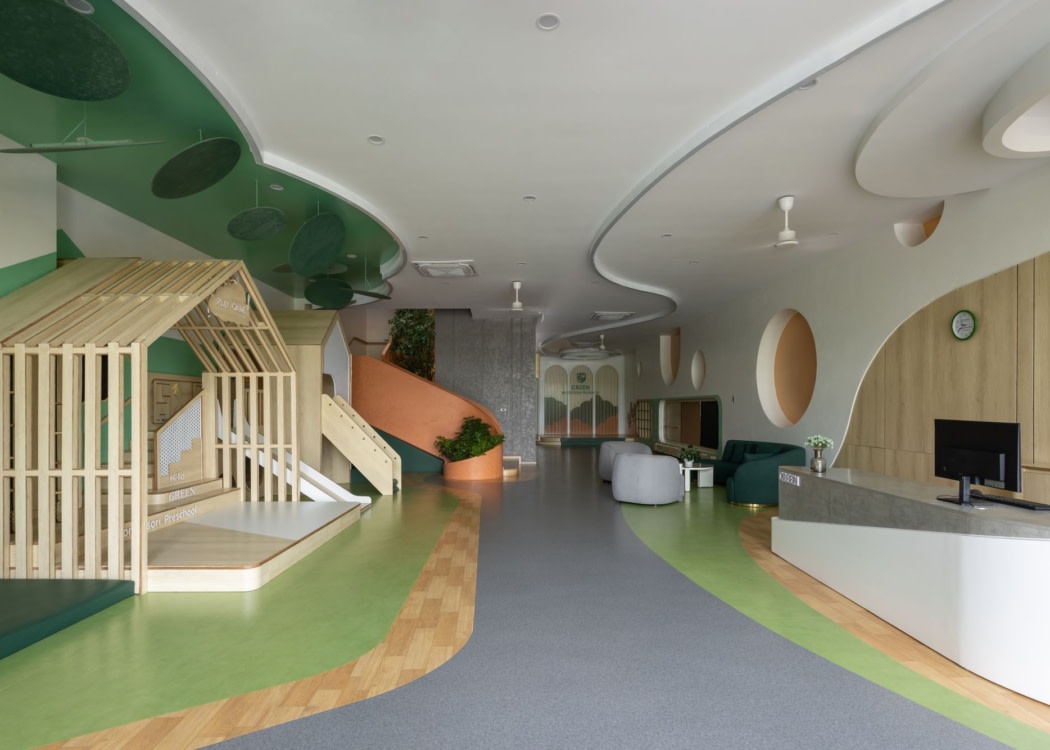 The color palette of green, earthy orange, and neutral tones evokes nature, creating a pleasant atmosphere and emotional balance. Key materials include natural wood, engineered wood, safe rubber/vinyl flooring, combined with abundant natural light and indirect lighting to ensure warmth and visual comfort throughout daily activities and learning.
